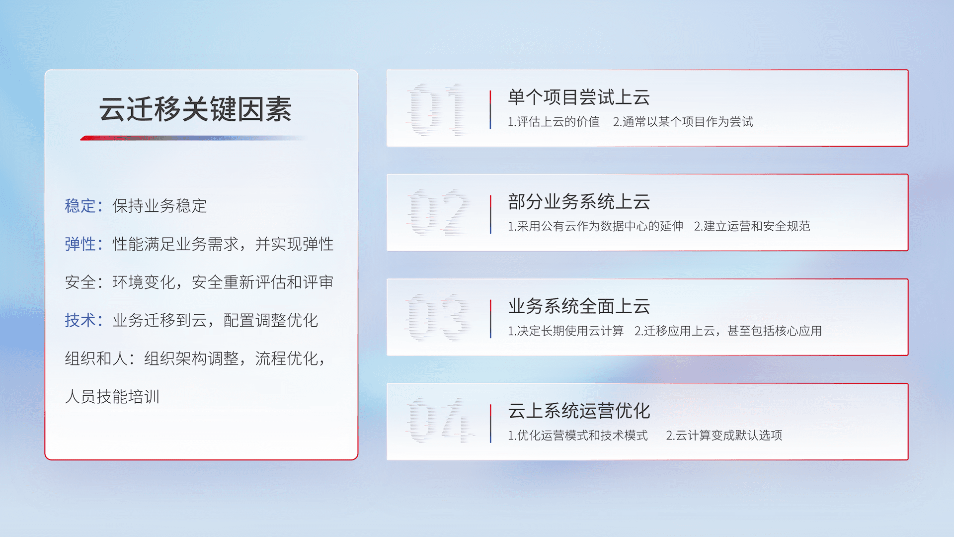 结合实际业务,,从规划设计、、云平台选型、、、云原生改造、、数据迁移、、集成交付,,,,迁移全过程为客户识别最佳上云路径,,,做好风险识别管理,,,,设计网络架构、、、、身份权限、、、安全审计合规、、操作审计、、日志审计、、监控告警策略、、、、多站点容灾设计等,,,对云上基础设施进行整体规划,,提升IT治理水平,,,以满足弹性、、高可用、、高性能的需求。。。。