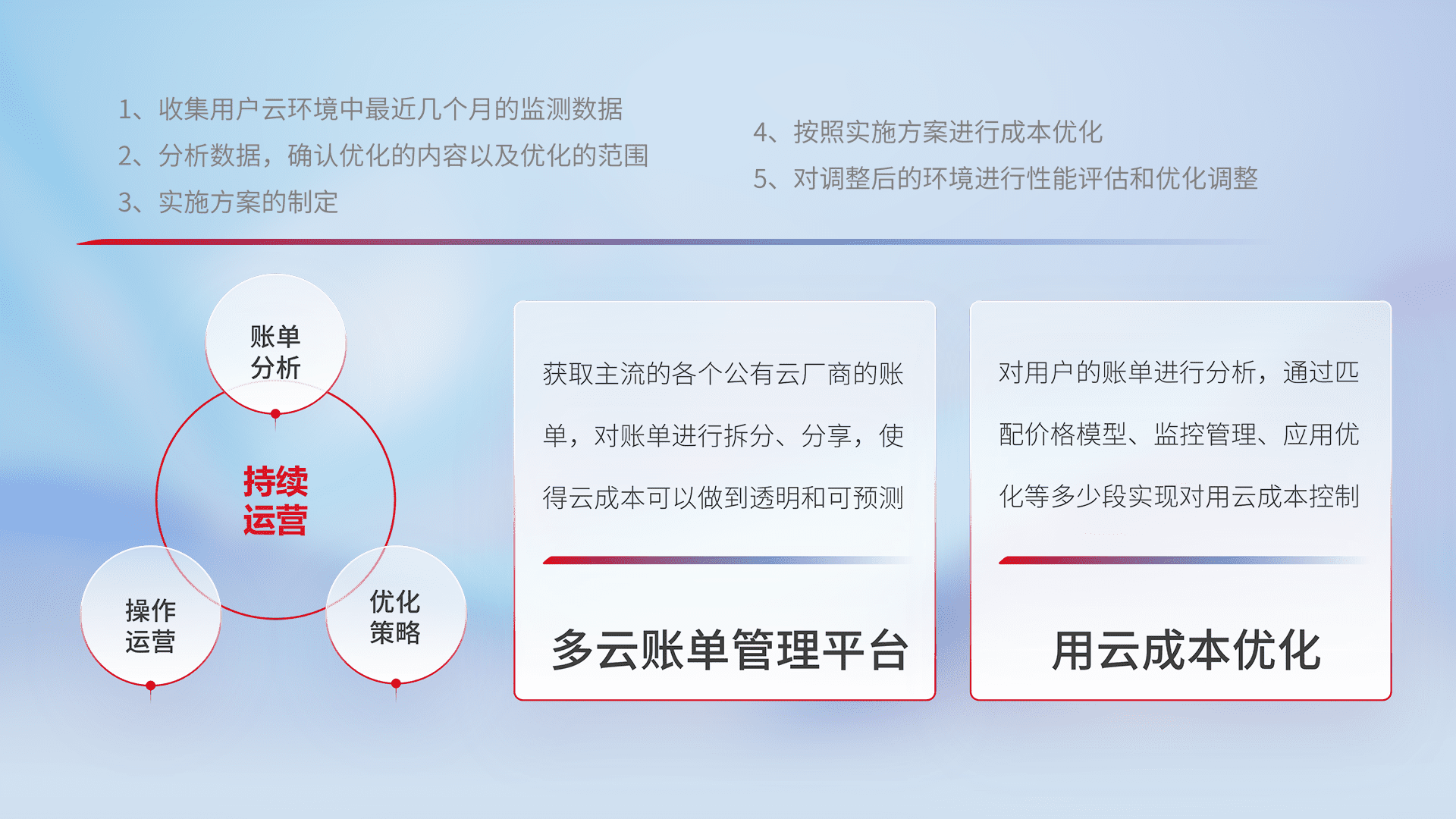 通过多云纳管,,,,以统一的资源数据模型把客户的云资源进行抽象和封装,,进而实现对多云资源的统一操作,,保障云资源管理的可靠性、、、稳定性与可用性。。。。量身定制化运维内容,,,,配置、、、开发运维、、、补丁管理、、备份、、监控、、认证和访问管理、、审计和日常巡检等,,,保障在用云过程中的可靠度,,,稳定度以及高可用率。。
